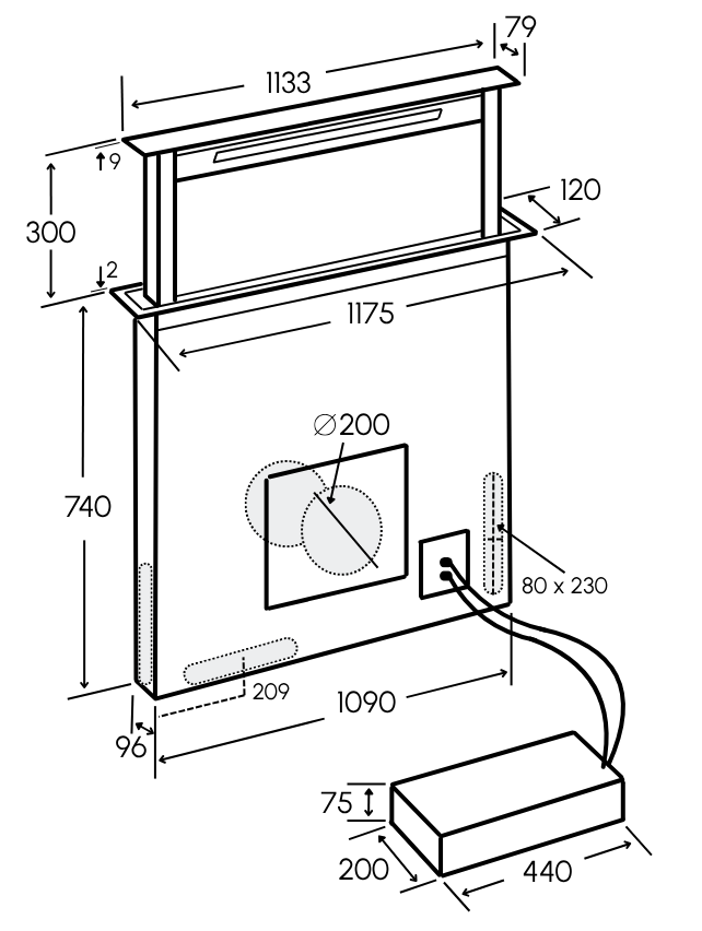 1180mm 'Le Luce' Downdraft Rangehood with Black Glass Fascia
