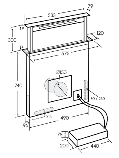 W575 x D120 x H740 below counter