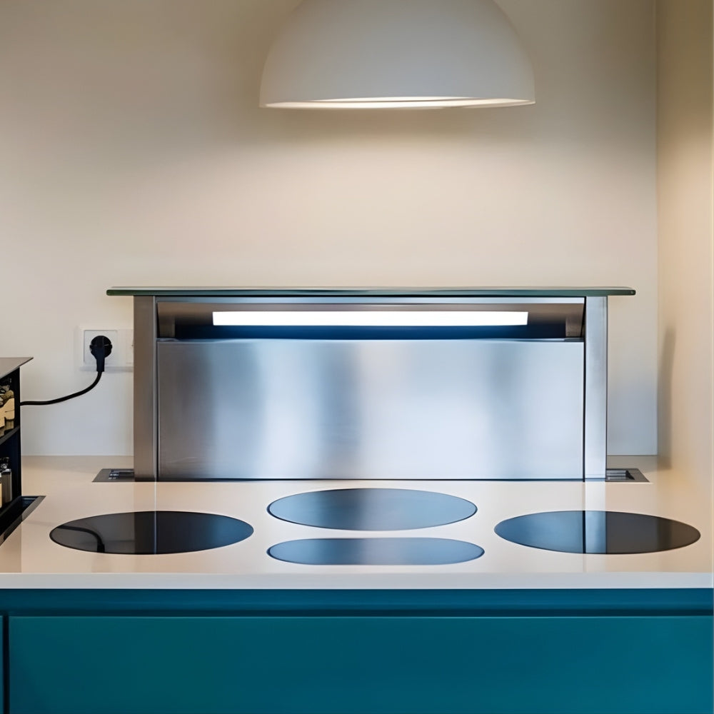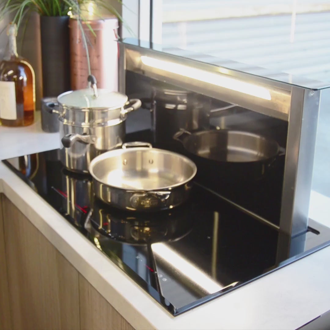 Powerful extraction as well as unobstructed views over an island bench, our Le Luce Range is this stunning downdraft rangehood that's Hand-Crafted in Italy, and designed for Australian living. This contemporary solution allows you to hide the appliance under the kitchen bench and, when needed, extend it up from the benchtop. With a sleek, flush installation and designer lighting, the downdraft is sure to be the talking point of the kitchen and is perfect for the open-plan kitchen concept, as the seamless design offers the best use of space.