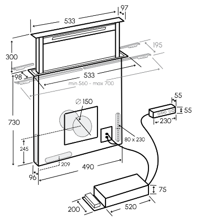 A simple to use control panel that’s wired to the transformer and mounted separate to the downdraft. This lets you mount your controls under the benchtop, where they're easily accessible, but hidden from view. Control the rangehood effortlessly, with features including child lock safety and integrated timer, this rangehood will make your cooking experience easy and enjoyable.